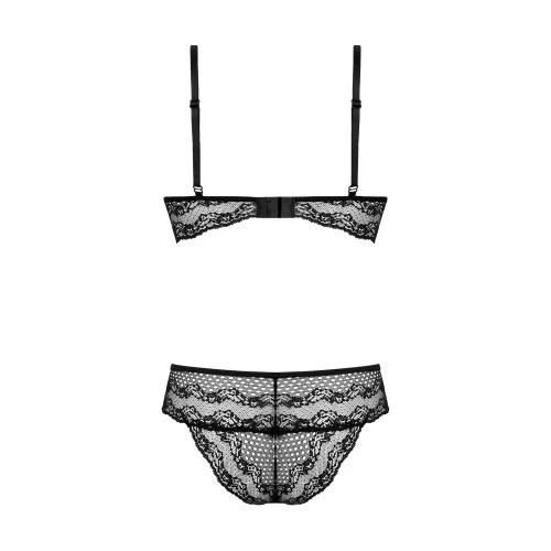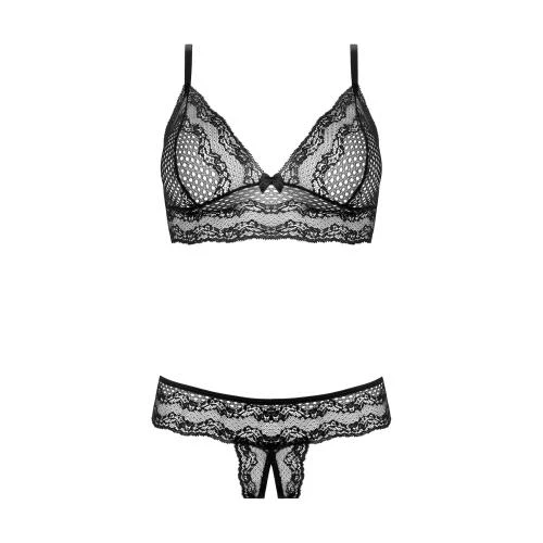 Verleidelijk setje gemaakt van zeer luxe kant. De combinatie van florale motieven met een netachtige structuur geven dit setje een unieke en bijzondere uitstraling. Het bralette topje heeft triangelcups (niet voorgevormd) en verstelbare schouderbandjes. Het topje kan je uitstekend ook los als everyday lingerie dragen, heerlijk zacht en met een goede pasvorm. Voor als je in een stoute bui bent heeft het slipje een open kruis. Gemaakt van hetzelfde luxe kant.