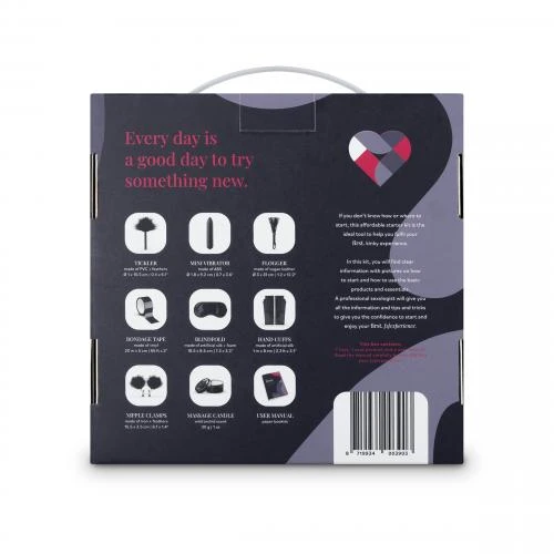In de box vind je veel moois om elkaar te teasen en te verwennen. Geef elkaar een ontspannende massage met de heerlijk ruikende massagekaars. Blinddoek en boei jouw partner met het satijnen oogmasker en linten. Gebruik de flogger voor een plagerige tik op de billen. Prikkel de huid met de veren kietelaar. Ontdek hoeveel intensiteit jij kunt verdragen met de verstelbare tepelklemmen of  ontneem iedere poging tot bewegen met het bondage tape. In de set vind je ook een krachtige bullet vibrator voor een heerlijke stimulatie op al jullie favoriete plekjes. De uitgebreide en eerlijk geschreven handleiding (Engelstalig) is tot stand gekomen in samenwerking met een ervaren seksuloog en staat boordevol uitleg, do’s en dont’s en maakt jullie zelfverzekerd genoeg om aan deze nieuwe ontdekkingstocht te beginnen!   Â
