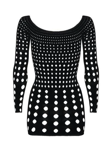 De zwarte Rocker jurk geeft je kracht en zorgt ervoor dat je je super sexy voelt! De jurk is een netwerk van perfect ontworpen gaten die je lichaam flatteren en je figuur accentueren. De blote schouders en lange mouwen benadrukken de jurk en maken hem uniek en onherhaalbaar.